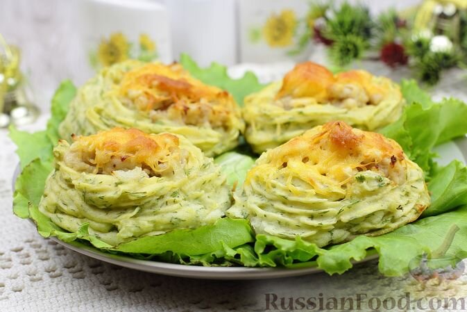 - Картофельные гнёзда с куриным фаршем и сыром: Это аппетитное блюдо из картофельного пюре и куриного фарша с запечённой корочкой станет прекрасной закуской.
