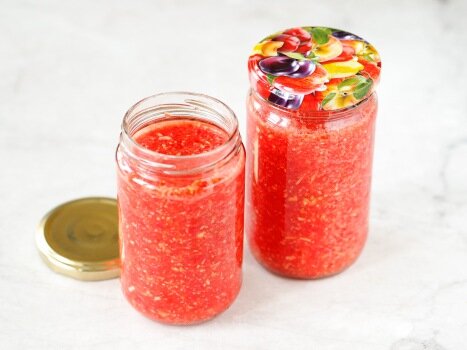 Этот соус идеально подходит для заготовки на зиму, так как готовится без термической обработки. Секрет хранения заключается в большом количестве чеснока и хрена, что помогает сохранить свежесть ингредиентов на длительный срок.