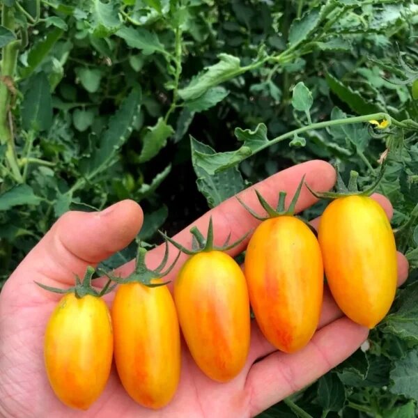 Этот томат отличается оригинальным внешним видом как куста, так и плодов. Компактный куст с густой темно-зеленой листвой не требует подвязки и пасынкования. Плоды на начальной стадии имеют желтый цвет с антоциановыми полосками, а при полном созревании становятся золотисто-оранжевыми, сохраняя свою округлую сливкообразную форму, что делает их идеальными для консервирования.