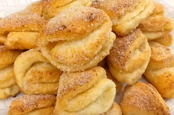 Ингредиенты и порядок напоминают базовый набор: творог, мука, масло, сахар и разрыхлитель — в разумной пропорции. Тесто складывают, режут кружочки и формируют треугольники с сахарной стороной внутри, выпекают до румяности.