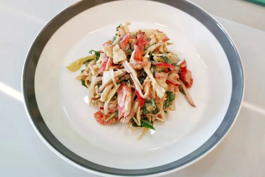 Главная идея здесь — минимальная подготовка и максимум вкуса. Капуста нарезается тонко, редис — соломкой, помидоры — лёгкими кусочками, а авокадо добавляет кремовую текстуру и насыщенный аромат. Рукола приносит свежесть и легкую горчинку, которая балансирует сладость помидоров.