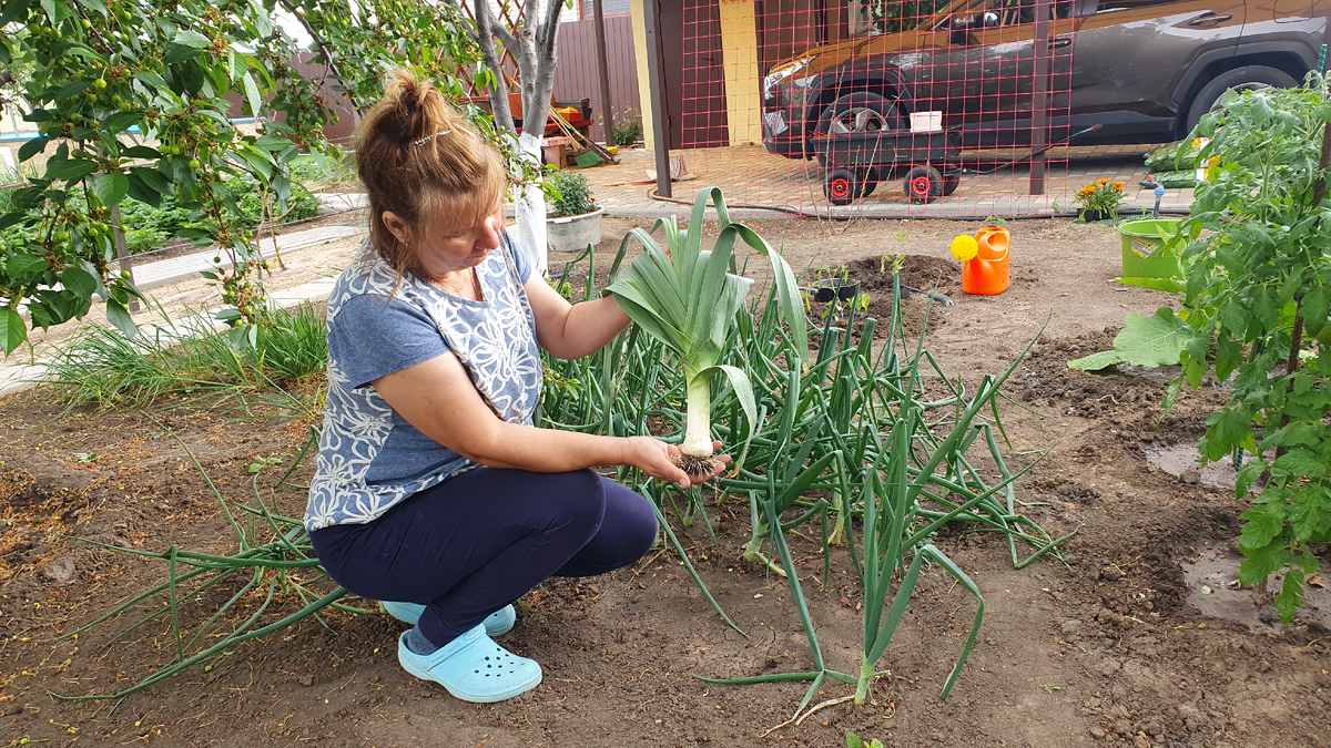 Привыкнув к новым условиям, лук-порей продолжает развиваться, становясь привычным и полезным элементом летнего стола.