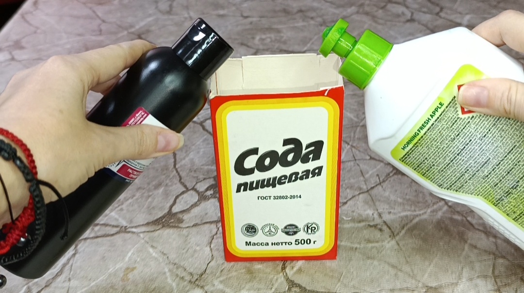 Трио из соды, перекиси водорода и моющего средства работает как единое целое: сода обеспечивает мягкий скраб, перекись — отбеливает и дезинфицирует, моющее средство связывает компоненты и помогает им держаться на вертикальных поверхностях. Вместе они создают пасту, которая легко справляется с жиром, нагаром и налетом на самых разных материалах.