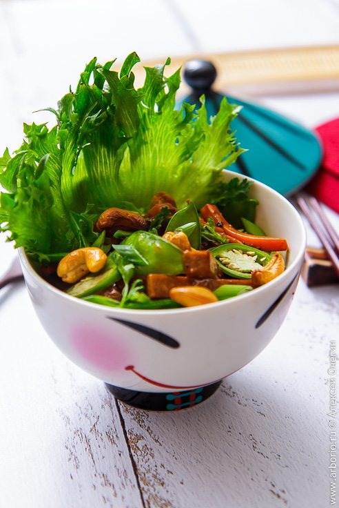 В основе — маринад: соевый соус, уксус и чуть сахара, которые соединяются с чесночной ноткой и перчиком по вкусу. Нежный тофу нарезают брусками и оставляют в маринаде, чтобы уловить каждую краску вкуса. Затем блюдо обжаривают вместе с овощами и посыпают кешью, добавляя текстурную игру и лёгкую маслянистость орехов.