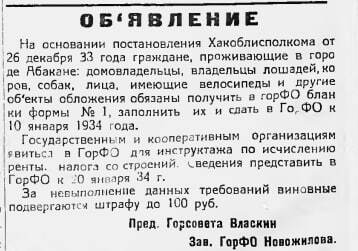 Объявление в газете «Советская Хакассия» от 9 января 1934 года: «На основании постановления Хакоблисполкома от 26 декабря 33 года граждане, проживающие в городе Абакане: домовладельцы, владельцы лошадей, коров, собак, лица, имеющие велосипеды и другие объекты обложения, обязаны получить в ГорФО бланки формы № 1, заполнить их и сдать в ГорФО к 10 января 34 г.