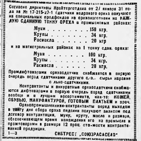 В 1931 году Сибтрест «Союзрасасело» предлагал сдатчикам кедрового ореха на каждую тонную от 100 до 150 кг муки, 34 кг круп и 20 кг растительных масел, а лучшим сдатчикам обещал дефицитные товары.