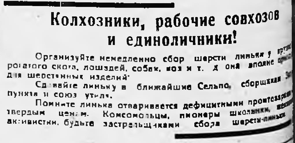 В 1933 году особым спросом пользовалась «шерсть-линька». Сбор шерсти нужно было «организовать немедленно», причём ни качество шерсти, видимо, ни её происхождение не имело значения: коровы ли это, козы, собаки или вообще «и т.д.». Сборщиков «линьки» также завлекали обещанием «отоварить дефицитными промтоварами по твёрдым ценам», а шерсть считали «вполне пригодной для шерстяных изделий».