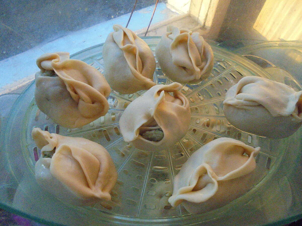 Когда тесто отдохнет, его следует разделить на небольшие кусочки и раскатать в круглые лепешки толщиной около 1-2 мм. Далее по центру каждой лепешки укладывается фарш, а края защипываются, формируя манты.