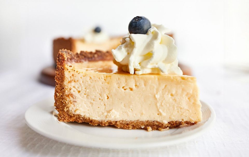 4. Перелейте получившуюся массу на корж и выпекайте в течение 45-50 минут при 150 °C. Центр чизкейка должен оставаться слегка дрожащим.