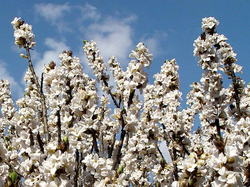 - Волчеягодник душистый (D. odora): кустарник, достигающий метра, известен своей сильной душистой аурой благодаря белым цветам с розовыми кончиками.