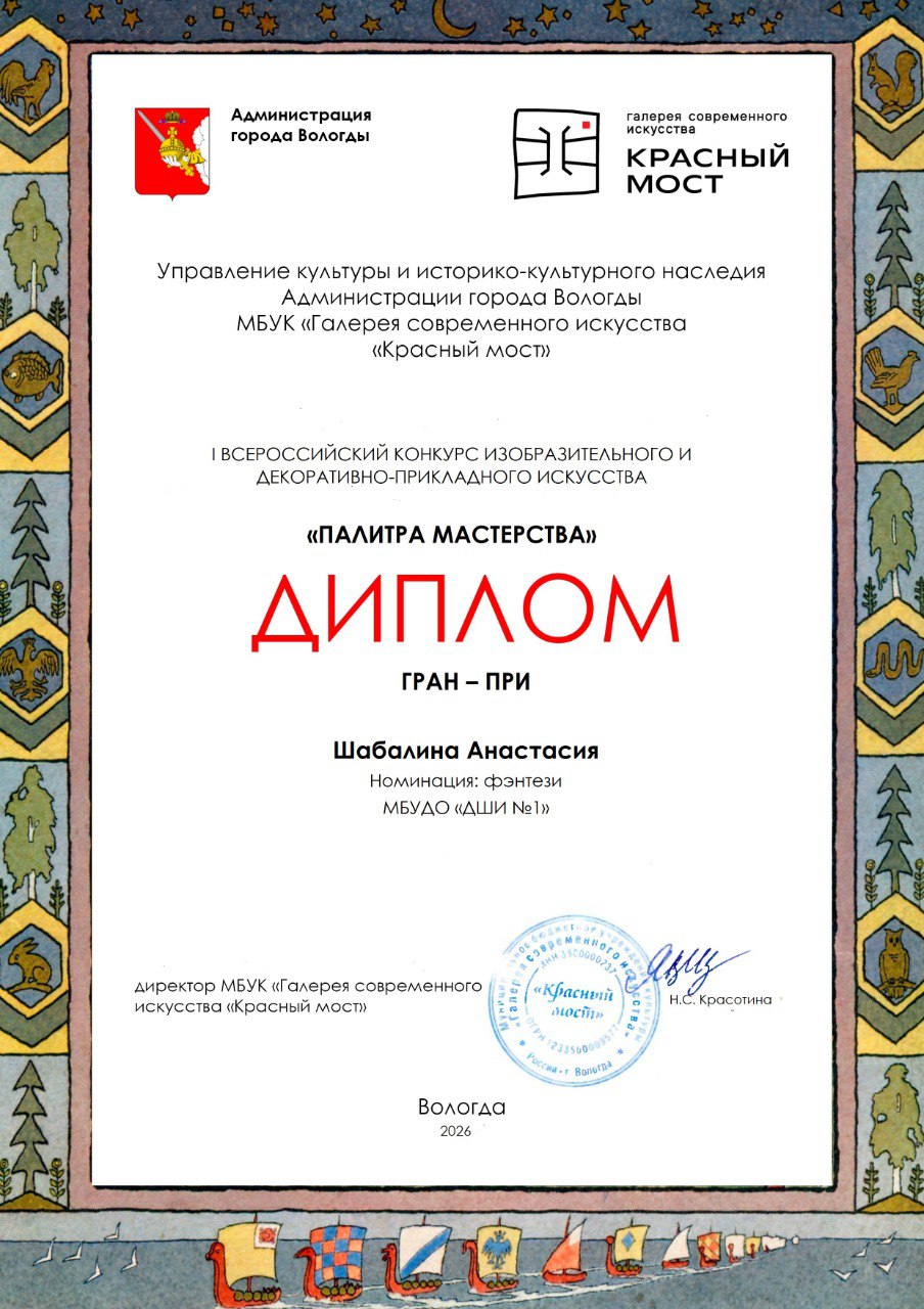 Итоги конкурса стали настоящим триумфом для нашей Детской школы искусств № 1. Преподаватели Дарья Олеговна Горинова и Анастасия Олеговна Шабалина получили гран-при в номинациях «Натюрморт» и «Фэнтези». Но и это еще не все! Талантливые воспитанники школы также покорили жюри. Виктория Таначакова, воспитанница Анастасии Шабалиной, завоевала гран-при в номинации "Жанровая картина".