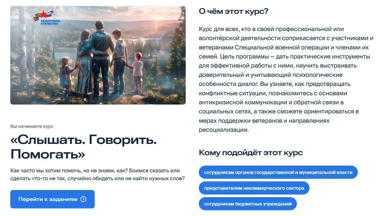 Цель курса — систематизировать знания и дать практические инструменты для комплексной поддержки защитников и их близких. Среди основных тем: особенности взаимодействия с участниками СВО и членами их семей, помощь в получении мер поддержки и др.