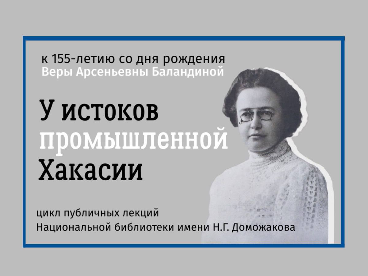 Национальная библиотека им. Н.Г. Доможакова приглашает на публичные лекции, посвящённые 155-летию со дня рождения Веры Арсеньевны Баландиной, в Абакане и Черногорске.
