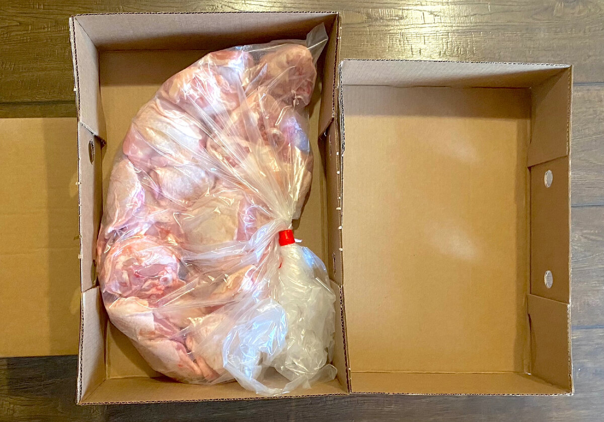 На недавней закупке было приобретено 10 кг куриных бедер. Мясо разделили: кости оставили для бульона, кожу отдали бездомным кошкам. Филе бедра пропустили через мясорубку, часть мяса разложили по пакетам и отправили в морозилку, другую часть переработали с луком и чесноком, приправили солью и перцем, сразу слепили пельмени и заморозили их порциями.
