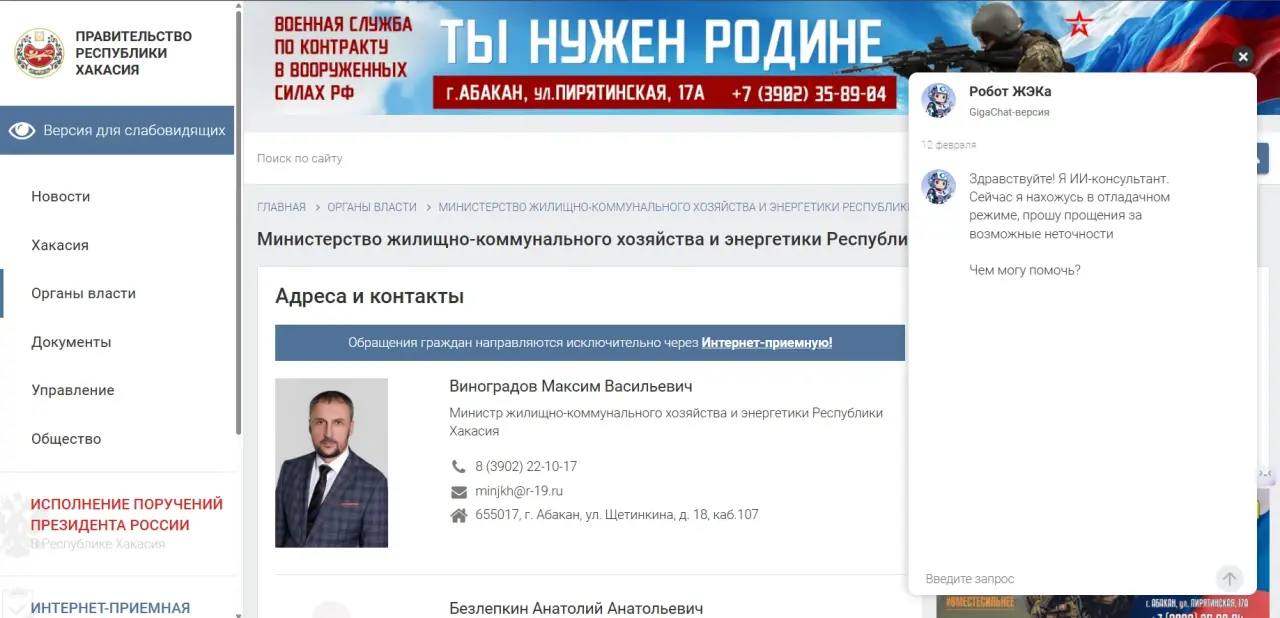 Напомним, недавно на портале правительства был запущен Чат-бот на базе GigaChat от Сбера для обработки обращений граждан по вопросам ЖКХ. https://r-19.ru/authorities/min-of-hcs-and-energy-rh/contacts/