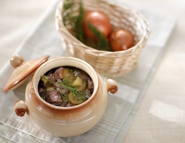 Теперь пора собирать все в горшочках: сначала укладывают картофель, затем огурцы, лук и добавляют горошины перца. Сверху выкладывают обжаренное мясо и заливают все белым вином. Добавляют воду так, чтобы она полностью покрывала мясо, а в конце помещают укроп.