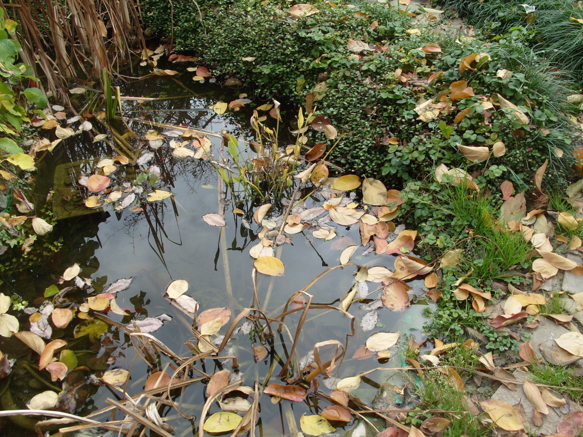 Одной из ключевых задач является уход за водными растениями. Например, у аира болотного рекомендуется срезать листья, оставив 10 см над уровнем воды, а у белокрыльника — убрать все листья до основания. К концу осени следует также обрезать ирисы аировидные. Листья рогозов и тростника стоит оставить, чтобы сохранить полынью. Если растения растут в контейнерах, ими стоит укрепить камни для надежного зимнего хранения.