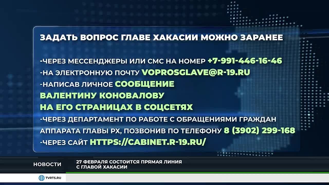 В течение полутора часов руководитель региона будет общаться с ведущими и зрителями, которые в ходе прямого эфира смогут дозвониться в студию по номеру телефона в Абакане: 8(3902)222-732.