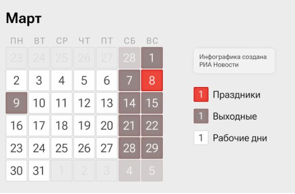 Международный женский день в 2026 году выпадает на воскресенье, поэтому праздничный выходной переносится на понедельник 9 марта. Таким образом у россиян, работающих по пятидневке, будет три дня отдыха — с 7 по 9 число, и всего 4 рабочих дня после.