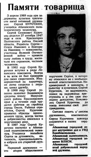 Имена на карте Абакана: улица Дружинника Курочкина. Сергей Семёнович Курочкин родился в 1947 году в селе Красногорка Полтавского района Омской области. В 1967 году поступил в Абаканский политехнический техникум, был старостой группы, стал одним из лучших народных дружинников.