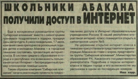В газете «Абакан» в публикации от 19 июля 2000 года появилась заметка о том, что школьники Абакана получили доступ в интернет: в гимназии благодаря спонсорской помощи компании «Сибирский алюминий» состоялась презентация интернет-класса.