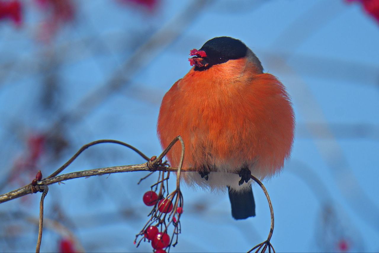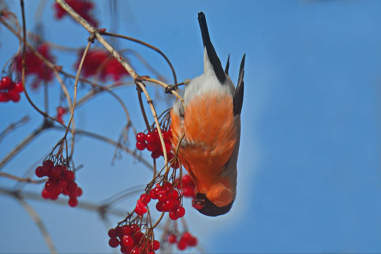 «Посмотрите на этого модника! Наш герой словно решил «подкрасить губки» к празднику 8 марта. Такой яркий «макияж» — вовсе не случайность, а секрет птичьего меню. Снегири — настоящие гурманы: в отличие от других пернатых, они не глотают ягоды целиком, а аккуратно вылущивают семена, при этом сочная мякоть зачастую пачкает клюв, создавая яркий акцент».