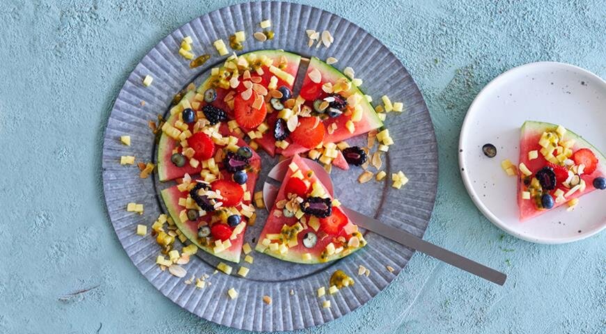- Освежающая «пицца» из арбуза: Необычное и забавное блюдо, которое изумит гостей и подарит массу веселья.
