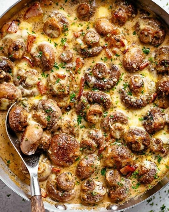 Эта очень простая, но удивительно вкусная закуска заставит вас забыть обо всех диетах! Восхитительное сочетание грибов, хрустящего бекона и нежного сливочного соуса создаёт настоящую симфонию для гурманов.