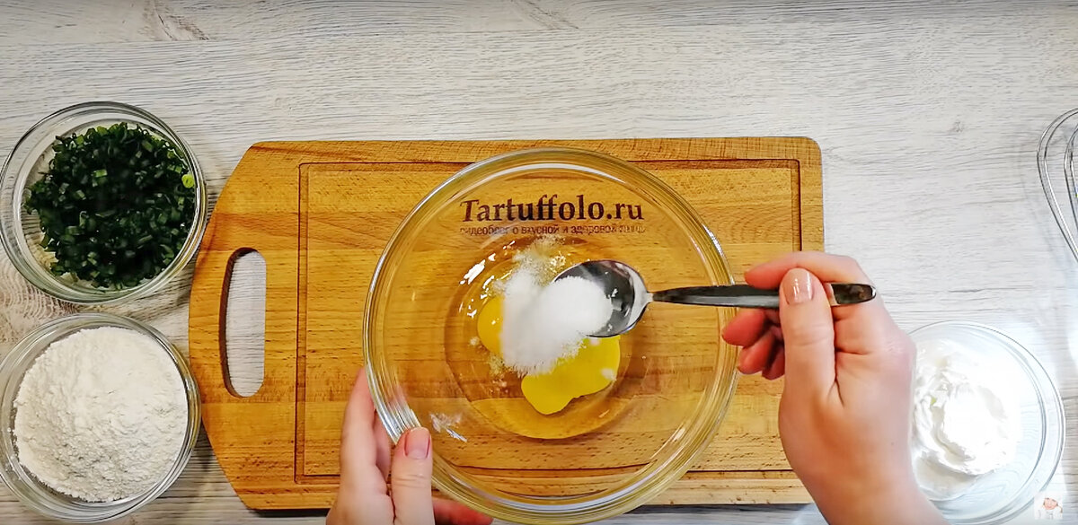 Начинаем с соединения двух крупных яиц, добавив к ним щепотку соли и половину столовой ложки сахара. Вливаем 200 г сметаны и тщательно перемешиваем венчиком до однородной массы.