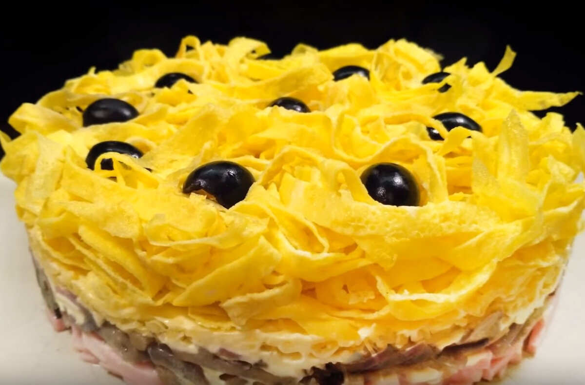 Последним слоем будут нарезанные яичные блинчики. Салат нужно отправить в холодильник на полчаса для пропитки, после чего его можно украсить маслинами и аккуратно снять кулинарное кольцо.
