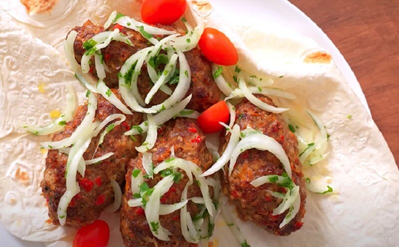 Готовый кебаб подается на листе тонкого лаваша с маринованным луком и свежими овощами. Приятного аппетита!