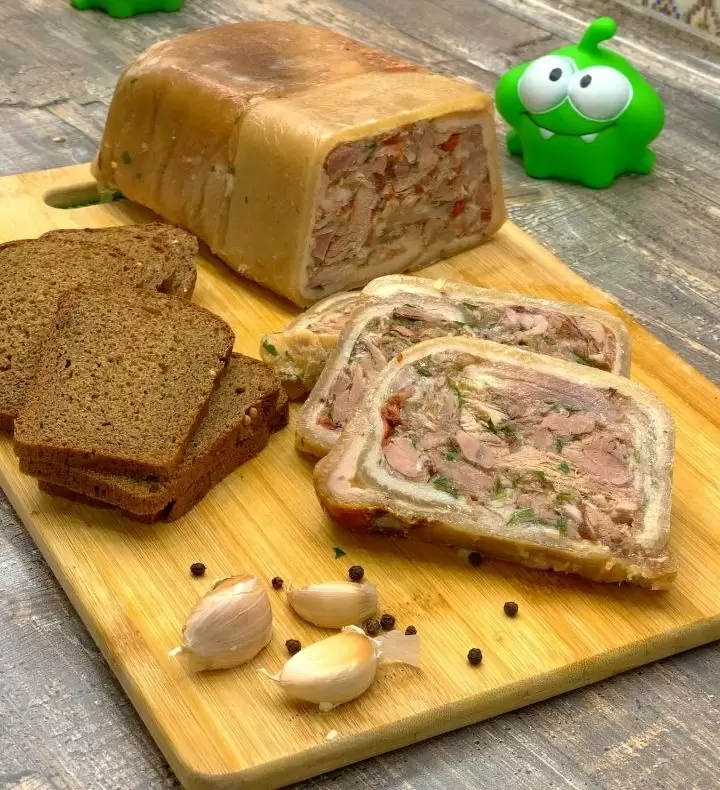 - Сервировка: Холодец лучше всего нарезать острым ножом и подавать с горчицей, хреном или свежей зеленью. Также допускается использование пищевой пленки для легкой демонстрации остывшего блюда.