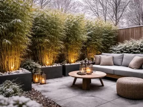 Живые экраны работают не только как визуальная преграда: бамбук в кадках и вечнозеленые кустарники создают плотную стену, которая сохраняется круглый год и не требует сложного ухода. Контейнерная высадка удобна в холодный сезон, позволяет сразу увидеть результат.