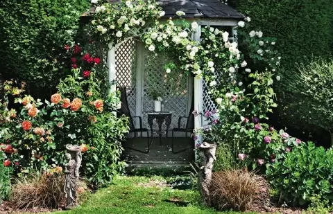 Разнообразие растений гармонично дополнит архитектурные формы. Вертикальное озеленение стен беседки и контейнеры с яркими цветами придадут свежести и характера вашей даче.