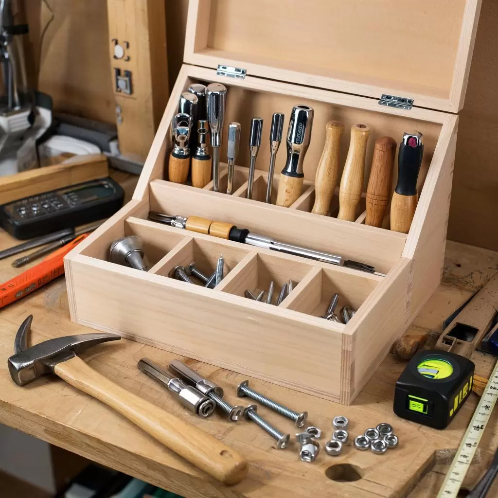 Для более аккуратного вида можно использовать столярный клей для фиксации перегородок, дополнительно прикручивая их саморезами. Не забудьте убрать излишки клея. Чтобы занять пространство более рационально, можно добавить второй уровень, прикрепив к боковине одну узкую рейку, на которую будут монтироваться короткие брусочки для мелких инструментов.