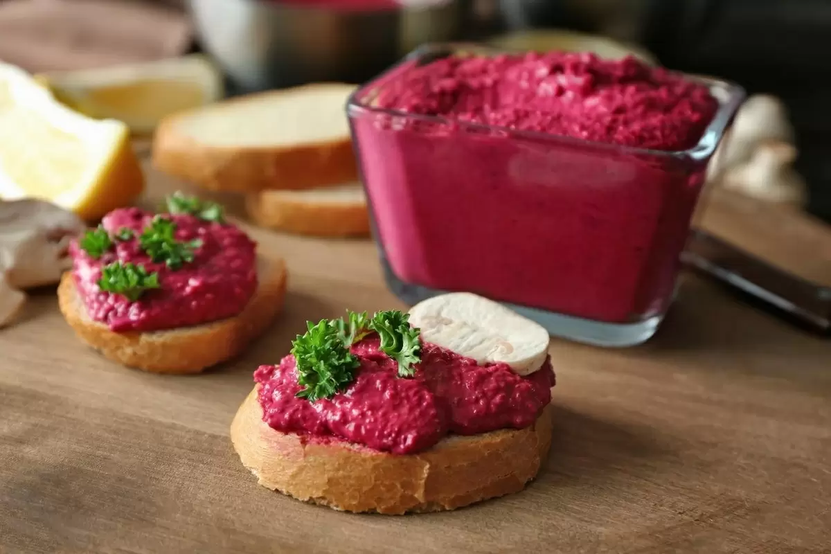 Эта намазка обладает небольшой остринкой и прекрасно сочетается с ржаным или цельнозерновым хлебом. Для её приготовления необходимо отварить две средние свёклы, затем очистить их и натереть на мелкой тёрке, избавившись от лишней влаги. Измельчаем 50 г грецких орехов и два зубчика чеснока. Все компоненты объединяем, добавляем соль, перец и столовую ложку оливкового масла.