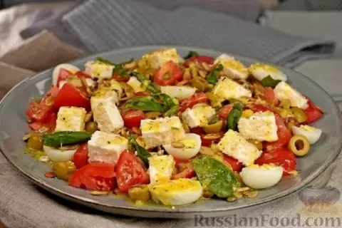 Завершает нашу подборку Салат из помидоров с оливками, фетой и перепелиными яйцами. Это рецепт не только быстр в приготовлении, но и настолько вкусен, что станет коронным блюдом любого праздничного ужина. Сочные помидоры, кисловатые оливки и нежная фета в сочетании с лимонно-горчичной заправкой заставят вас снова и снова возвращаться к этому блюду.
