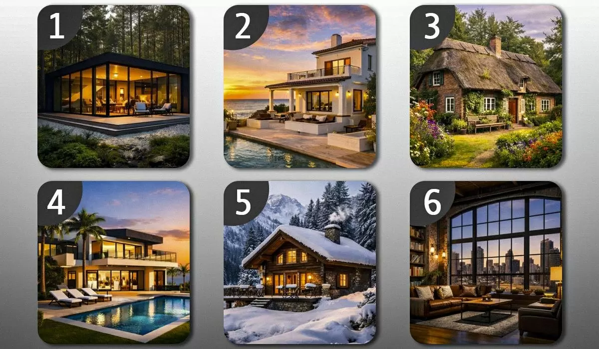 Этот тест основывается на вашем выборе дома и отличается высокой точностью. По тому, какой дом вы предпочитаете, можно многое узнать о вашей личности. Внимательно посмотрите на шесть изображений вилл и выберите тот, который вас вдохновляет больше всего.