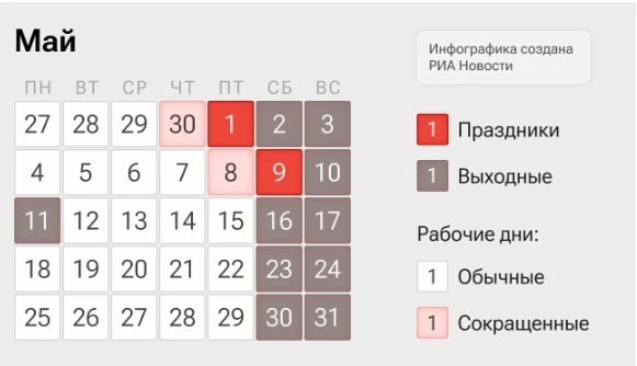 Следующие длинные майские праздники — с 9 по 11 число. В пятницу 8 мая — рабочий день сокращен на час.