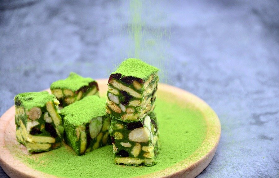 Измельчите печенье до состояния небольших кусков, похожих на орехи. Смешайте его с орехами и клюквой в одной миске.На медленном огне растопите масло в глубокой сковороде, добавьте маршмеллоу и постоянно помешивайте, пока они полностью не растворятся.Как только смесь будет готова, выключите огонь и добавьте 50 г сухого молока и 10 г порошка матча. Тщательно перемешайте, чтобы ингредиенты как следует соединились.Выложите в сковороду ореховую смесь и перемешайте так, чтобы каждый кусочек покрывался сладкой массой.Положите массу на пекарскую бумагу и придайте ей форму прямоугольной плитки толщиной 2,5-3 см. Для удобства можно воспользоваться перчатками.Когда десерт немного остынет, посыпьте его остатками сухого молока и порошка матча через мелкое ситечко. Нарежьте на мелкие кусочки и наслаждайтесь!Приятного аппетита!
