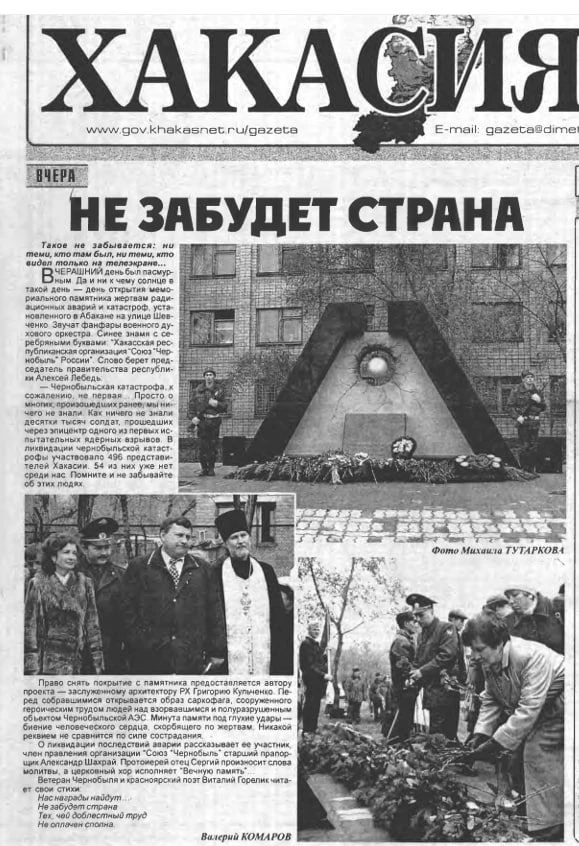 17 октября 2006 года на улице Тараса Шевченко у здания станции скорой помощи был установлен памятник жертвам радиационных аварий и катастроф. Автор проекта – заслуженный архитектор Республики Хакасия Григорий Кульченко. Инициатором открытия памятника стала Хакасская республиканская организация «Союз Чернобыль России».