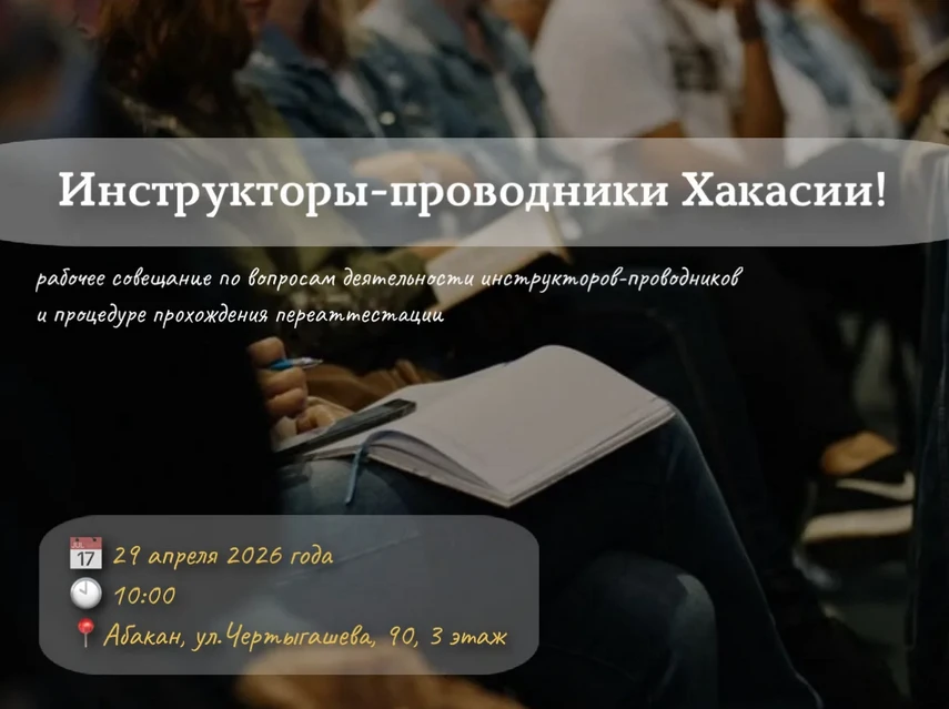 29 апреля 2026 года в 10:00 в Абакане (ул. Чертыгашева, 90, 3 этаж) состоится рабочее совещание, посвященное вопросам деятельности инструкторов-проводников и процедуре прохождения переаттестации.